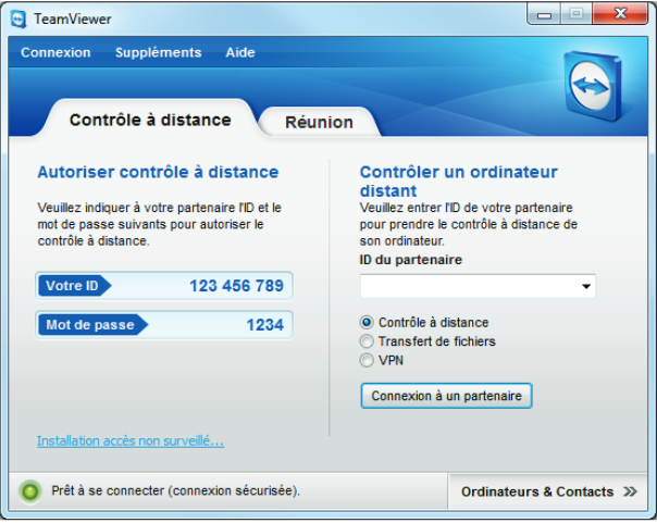 La fenêtre principale de TeamViewer se divise en deux onglets : Contrôle à distance et Réunion.